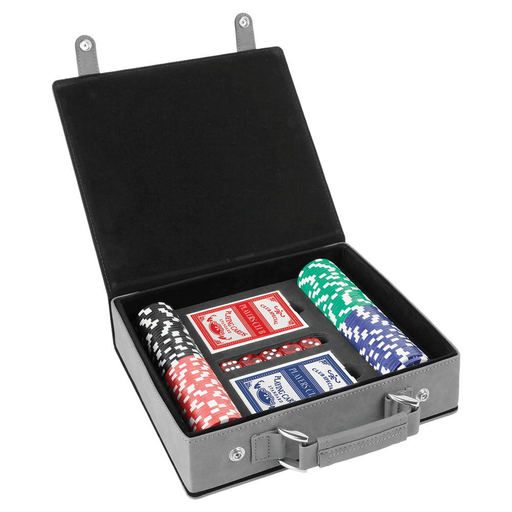 This poker gift set contains 100 commercial grade chips, 2 decks of cards, and 5 dice. The box itself is crafted of black/gold Leatherette and features a black felt lining, carry handle, and snap closures to keep the contents secure.